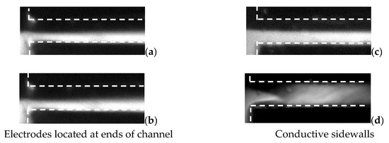 Figure 5 clearly shows that, under electric field 200 V/cm, obviously stronger mixing has been achieved in the micromixer with conductive sidewalls, as shown in Figure 5d. However, in the micromixer with the nonconductive sidewalls, where the electrodes are located at ends of the channel, no obvious mixing enhancement was observed (Figure 5b).