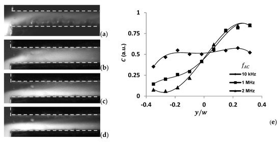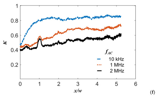 Figure 6 shows the results of mixing under DC voltage and different frequencies of AC voltage. When 10 KHz, the mixing performance is stronger than that when the frequencies are 1 MHz and 2 MHz. When DC voltage was applied on electrodes, strongest mixing was achieved in a very short time. However, bubbles were also generated within 1 s since voltage was applied. The channel was finally blocked by these bubbles. C distributions in the transverse direction are shown in Figure 6e for three different AC frequency mixing results. According to this quantitative distribution, when 10 KHz, concentration distribution reaches relative uniformity at from the entrance. At the same streamwise position, however, when 1 MHz and 2 MHz, the profiles of the concentration distribution are still far from uniform. From Figure 6f, it can be seen that is always the largest at 10 KHz, compared with that under other AC frequencies.