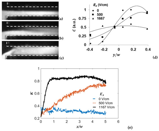 Figure 9d shows the quantitative concentration C distribution in the transverse direction, at streamwise position away from the entrance. It shows that, C distribution under 1167 V/cm reaches relative uniformity at from the entrance, while at the same streamwise position, the profile of the concentration distribution under of 0 and 500 V/cm are still far from flat. The same consequence can also be concluded from Figure 9e, where higher electric field results in higher mixing index. Especially at 1167 V/cm, reaches 0.83 at , which only costs time in the amount of 14 ms. All the results indicate that mixing is enhanced rapidly with increased electric field in the conductive sidewalls micromixer.