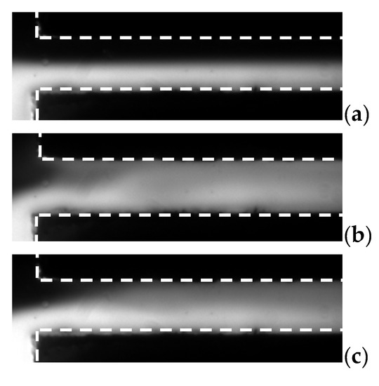 As visualized in Figure 10, the mixing is strongest at a given downstream position when the Re number was 0.1, compared with situations where the Re numbers were 0.3 and 0.5. The mixing length (the downstream distance from the inlet of the channel required for the mixing to be achieved in the transverse direction, not the Prandtl mixing length in turbulent flows) is much shorter when low Re number was applied than when high Re number was applied. Note that although the mixing length is shorter at lower Re, the mixing time (required for the mixing to be achieved in transverse direction) is not necessarily shorter because the bulk flow velocity is larger in the higher Re.