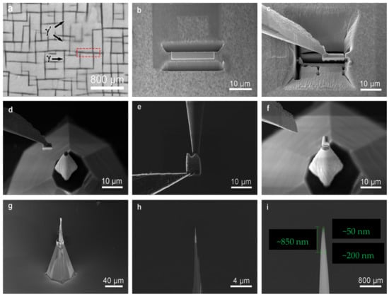 - Thompson, K.; Lawrence, D.; Larson, D.J.; Olson, J.D.; Kelly, T.F.; Gorman, B. In Situ Site-Specific Specimen Preparation for Atom Probe Tomography. Ultramicroscopy 2007, 107, 131–139. [Google Scholar] [CrossRef]