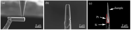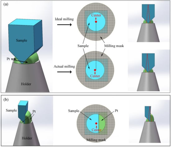 In the standard lift-out method, the sample is proposed to be a wedge-shaped square column, as shown in Figure 2a. In the process of manual milling, the ion beam is perpendicular to the upper surface of the sample, and the area of the upper surface of the sample is larger than that of the lower surface of the sample, so it is difficult to determine the welding center. During the practical manufacture process, the welding center of the sample is easy to produce deviation, thus cutting out the PT for welding, as shown in Figure 2a, which makes welding the joint very fragile, resulting in the sample fracture in APT analysis as shown in Figure 3. Therefore, we hope to find a suitable sample shape so that the solder joint between the sample and the holder can be easily determined during manual milling so as to strengthen the welding. Our new design strategy is to change the wedge lift sample into a single wedge, as shown in Figure 2b. In this way, when the ion beam is observed, the welding point between the sample and the bracket can be easily obtained, and enough welding platinum can be reserved during the encircling process to strengthen the welding stiffness of the sample.