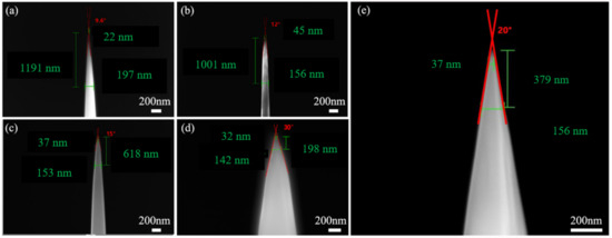 Example of the single-wedge lift-out APT specimen tip shape. (a) Tip 9°; (b) tip 12°; (c) tip 15°; (d) tip 30°; (e) tip 20°.