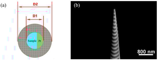SRIM-2013 is used to qualitatively analyze the Ga ion induced damage distribution in Al/Ni substrate from the perspective of Monte Carlo simulation, as shown in Figure 6. Among them, the Ga ion induced damage peaks are at ~2.2 nm, ~3.1 nm and ~8.5 nm, corresponding to 3 keV, 5 keV and 30 keV, respectively. It can be seen that the damage peaks ranging from 2 nm to above 10 nm with an impact energy ranges from 3 keV to 30 keV, showing a significantly increasing trend of damage concentration. In experimental studies, the tip shape is also an important factor in APT analysis. It is well known that there are many defects, such as vacancies, at the interface between the grain boundary and the phase boundary in the three-dimensional atomic probe experiment, which can lead to the fracture of the interface tip. As shown in Figure 7, we take the uniform silicon sample as the research object, and improve the stability of the sample by controlling the shape of the tip so as to avoid the tip fracture at the interface. The results show that when the taper is greater than 12° and in order to consider the sample collection amount of APT, the optimal cone angle of the tip is about 20° as shown in Figure 7e. In order to obtain the taper angle, it is necessary to control the diameter D2 and D1 of the grinding mask. After the inner ring is determined, if the outer ring diameter is reduced, the cutting area will be greatly reduced, and the cutting efficiency will be improved, but the needle tip will also become steep and vulnerable to brittle fracture; if the outer ring diameter is larger, the cutting area will be larger, and the cutting efficiency will be reduced, but the cone angle of the needle tip will be significantly larger, and there will be burr on the outside of the needle tip, which will affect the APT analysis results.
