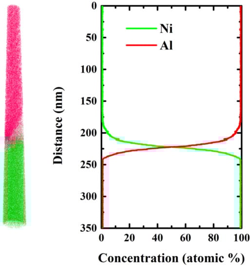 Al/Ni multilayers are composed of alternating layers of Al and Ni, which have the characteristics of high chemical energy storage, fast energy release and fast combustion. They have potential application prospects in the following reaction ignition, thermal battery ignition and local heating. They are mainly used for welding and bonding [21]. A small thermal pulse will cause atoms to diffuse into the layer and lead to a rapid exothermic reaction, thus further establishing the self-propagating reaction [22]. In order to understand these behaviors, people have devoted themselves to basic research, such as final products, phase transition sequences and high concentration gradient effects. Particularly, the intermixing region in the interfaces not only changes the phase sequence, but also reduces stored chemical energy, especially as the modulation period drops below 50 nm. For instance, Al9Ni2 was observed as the primary phase in the multilayers with a modulation period larger than 25 nm, which could be explained by a nucleation model based on thermodynamics and diffusional intermixing. In this paper, Al/Ni multilayers APT sample were successfully prepared by the focused ion beam technique, which reduced the amorphous damage layer of Ga ions.