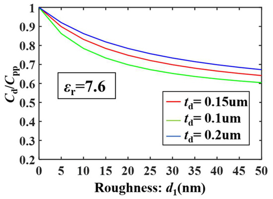 where d1 is the roughness, as shown in Figure 2, when the roughness is 50 nm, Cd is reduced by 30%. The dielectric thickness and εr also have a greater impact on the capacitance.
