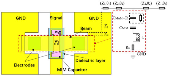 A simple and effective approach to obtain a high capacitance ratio of a MEMS switch is to connect a shunt capacitor [16,18]. To improve the capacitance ratio without degrading the reliability of the switches, a metal-insulator-metal (MIM) fixed capacitors is adopted in the design, as shown in Figure 3. The MIM capacitor connects to a metal-air-metal (MAM) capacitor in series in up state, and the MAM is changed to resistance R in down-state. Cr can be calculated by the following equation: