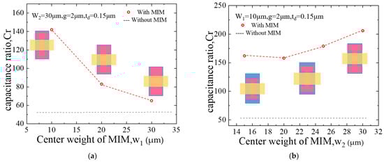 In order to compare the influence of MIM capacitor size on the capacitance ratio, simulate a switch based on silicon (εr = 11.9). A 0.15 μm-thick Si3N4 standard dielectric material is used. The CPW line has a size of 60/100/60(G/S/G) μm, and the size of the beam is 220 μm width and 500 μm length. For the switch without MIM capacitors, the up-state capacitance, down-state capacitance, and capacitance ratios can be calculated simply [19] as 57.8 fF and 3.18 pF, 55. Figure 4 shows the relationship among the parameter of w1, w2, and Cr for the switch with MIM capacitors.
