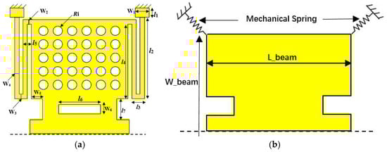 Due to the small amount of deformation, the switch beam can be equivalent to a rigid body, and its mechanical properties can be described by linear elastic coefficients [16]. A simple and effective approach to obtain a low actuation voltage of a MEMS switch is to reduce the spring constant of the beam. This paper designs a switch structure as shown in Figure 4a. In order to reduce the spring constant, the switch uses a bending folding beam, which is fixed on the ground by four anchor points. The switch structure and simplified model are shown in Figure 5.