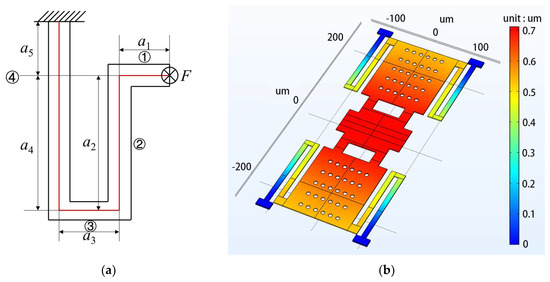 As shown in Figure 6a, in order to calculate the spring constants of the supporting beam, the equivalent mechanical spring structure can be divided into ① ② ③ ④ four parts, one end is specified and the other end receives a force F perpendicular to the surface of the paper. Then the strain energy of each part are calculated in Table 1.