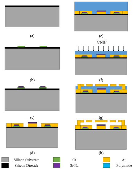 The process of the device: (a) silicon substrate after oxidation; (b) after patterning of the high-resistance direct current (DC)-bias line; (c) after patterning of the Si3N4 dielectric layer; (d) after patterning of coplanar waveguide (CPW) lines; (e) spinning of polyimide to form sacrificial layer; (f) Chemical mechanical polishing (CMP) to decrease surface roughness of polyimide; (g) patterning of gold layer to form MEMS beams and anchors; (h) removal of the sacrificial layer.