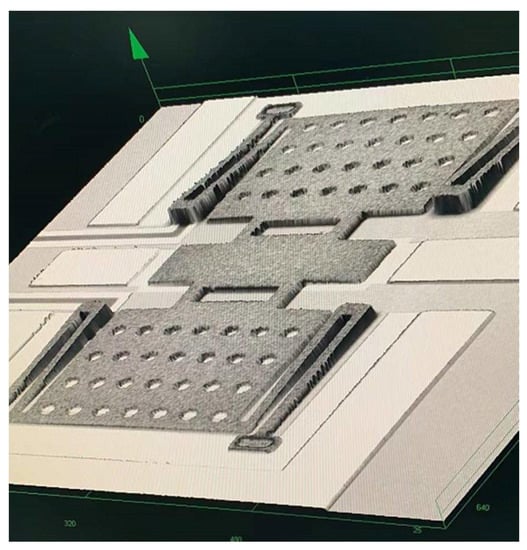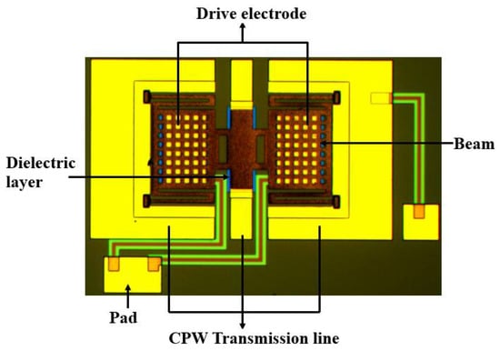 The fabrication process of the MEMS switch is shown in Figure 7. The switch is fabricated on 400 μm thickness high-resistance silicon, and a layer of SiO2 is located above it. Furthermore, photolithograph negative glue was used to photoetching DC bias lines pattern, electron beam evaporation Cr DC bias lines, then stripped photolithograph negative glue, and 0.15 μm-thickness Si3N4 is deposited on top of the bias lines. Au layer of 0.2 μm thickness, as CPW lines, is sputtered on the substrate, and a layer of Si3N4 is located on the top of the transmission lines as a dielectric layer. A 2 μm-thick polyimide is used as the sacrificial layer after the thermal curing process. The 1.6 μm-thick anchors and beams are formed by electroplating technology. The sacrificial layer is released using supercritical dry release. Figure 8 show the micrograph of the fabricated MEMS switch.
