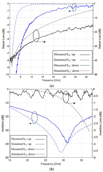 As shown in Figure 10, S11 and S12 of the measured and simulated results are well matched. The measured results show that the return loss is better than −1 dB at 30 GHz in up stated condition, and it is more than −10 dB from 25 GHz to 35 GHz in down stated condition. The insertion loss is better than −0.5 dB at 30 GHz, and the isolation is more than −20 dB from 25 GHz to 35 GHz with an actuation voltage of 15.8 V. The maximum isolation is achieved −39.2 dB at 31.3 GHz.