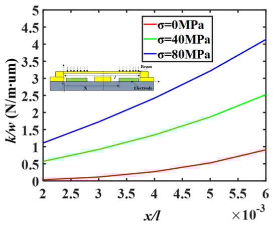 where Ks, Kr are the spring constants caused by stiffness and residual stress respectively, x is the position of the load, σ is the residual stress. When x = 2l/3, σ = 0 MPa, 40 MPa, 80 MPa, l = 200 μm, t/l = (0.002–0.006), as shown in Figure 12, the total spring constants of the Au (E = 78 GPa, v = 0.44) beam increases significantly with the increase of residual stress.