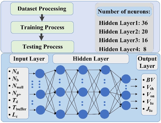 Recently, machine learning techniques for predicting the electrical characteristic parameters of the semiconductor device have been booming due to their ability to learn the relationship between structural parameters and characteristics efficiently [8,9,10,11,12,13]. However, most work is limited to providing only one characteristic parameter, such as the threshold voltage of a junctionless nanowire transistor [11] or the breakdown voltage of a lateral power device [12]. As for those that can output multiple characteristics, the characteristic parameters are extracted from the current–voltage (I-V) curve and capacitance–voltage (C-V) curve, which still relies on human-intensive operation [13]. In addition, machine learning is applied to predict the current value of IGBTs in circuits and suppress the current imbalance of parallel-connected IGBTs through artificial neural networks, or to predict the remaining lifetime of the IGBTs operating in circuits [14,15,16]. However, the focus of these works is on monitoring and optimizing IGBT operations in the circuit, rather than on exploring the relationship between the device’s structural parameters and characteristic parameters.