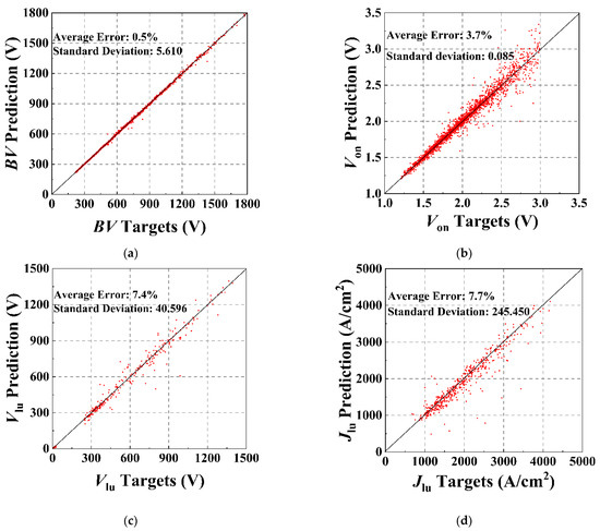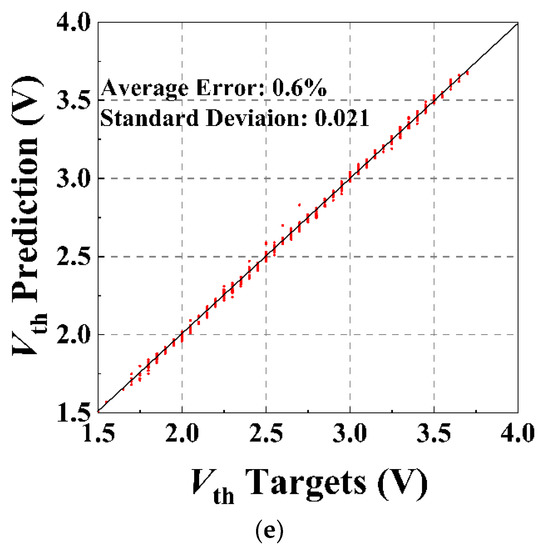 Figure 4a–e are scatter plots showing the correlations between the target BV, Von, Vlu, Jlu, and Vth and those predicted by the ANN method, while the number of training samples used for the prediction of the different characteristic parameters is described in the caption text. The number of training samples is influenced by the convergence of the simulation and the complexity of the predicted characteristic parameters, which will be discussed more closely later in this paper. Compared to the TCAD simulation results, the average errors for BV prediction and Vth prediction can be controlled to within 1%. For IGBT, BV falls between the avalanche breakdown and the reach-through breakdown limits, and is governed by the open-base transistor breakdown phenomenon. The open-base transistor breakdown condition for the IGBT is given by Equation (2), where the αpnp is the common-base current gain, which is related to the injection efficiency γE, the base transport factor αT, and the multiplication coefficient M. By derivation, αT and M are in turn related to Nd and Td [21]. Vth is primarily associated with the doping concentration of the channel region, Nwell. The number of structural parameters affecting these two characteristic parameters is small, so the ANN can predict the BV and Vth of the IGBT very accurately. However, Von, Vlu, and Jlu are closely related to on-resistance, and the parameters of the drift region, buffer region, and channel region all impact the on-resistance of the device. The more structural parameters affect the static characteristic parameter, the more complex the prediction of the characteristic parameter is. Nevertheless, the average errors of our proposed scheme are all within 8%, which proves that the number of layers and neurons of the framework is well set so that it has sufficient fitting ability and can avoid overfitting problems due to the high fitting ability.