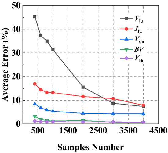 We can also analyze the influence of the number of training samples on the prediction results. The testing set consisted of 400 IGBT samples with different structural parameters, and the number of samples in the training set was increased from 400 to 4000. Figure 5 shows the variation curves of the ANN’s prediction average error for five static characteristic parameters as the number of samples in the training set increased.