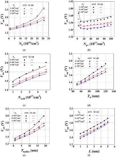 Taking the Von prediction as an example, we can further analyze the fitting results of the trained ANN relating to the relationship between the structural parameters and characteristic parameters of the IGBT. Figure 6a–f show the comparisons of the prediction results of the ANN method and the TCAD simulation with different structural parameters, including Nb, Np+, Nwell, Td, Tbuffer, and L, respectively. Based on the initial structures, the structural parameters were sequentially changed. The initial structural parameters are shown in the caption. We have taken three different doping concentrations in the drift region into consideration.
