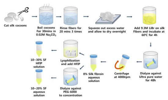 For preparing the HFIP-based SF solutions, aqueous SF solution was first lyophilized, after which the lyophilized SF was dissolved in HFIP to produce 10%, 20%, and 30% SF solutions. The 10% and 20 wt% aqueous SF solutions were prepared by dialyzing against 10 wt% polyethylene glycol (6000 MW, Sigma-Aldrich, Burlington, MA, USA) solution for 12–24 h (Figure 1).