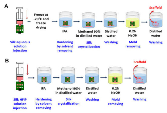 Schematic diagrams of the sacrificial molding process and SF scaffold fabrication depending on the solvent: (A) water and (B) HFIP.
