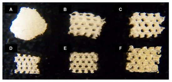 Images of (A) salt-leached, (B) 10% aqueous, (C) 20% aqueous, (D) 10% HFIP-based, (E) 20% HFIP-based, and (F) 30% HFIP-based SF scaffolds. Controlled pore shape and size were observed in all of the SF scaffolds manufactured through indirect 3D printing. The aqueous-based SF scaffold was white while the HFIP-based SF scaffold was a transparent yellowish color.