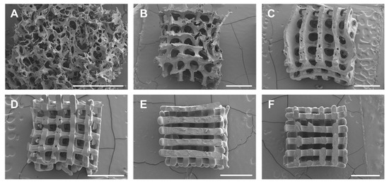 SEM images of (A) salt-leached, (B) 10% aqueous, (C) 20% aqueous, (D) 10% HFIP-based, (E) 20% HFIP-based, and (F) 30% HFIP-based SF scaffolds. The pore size, shape, and geometry of the aqueous and HFIP-based SF scaffolds fabricated via 3D-printed molds were relatively well controlled whereas the salt-leached scaffolds exhibited non-uniform pore size and shape (scale bar: 1 mm).