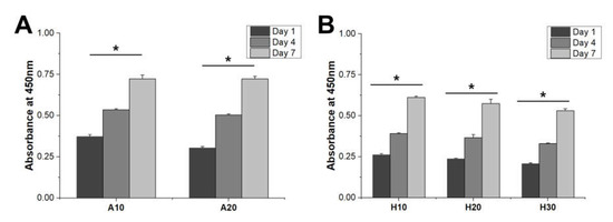 Cell Counting Kit-8 (CCK-8; Dojindo Laboratory, Kumamoto, Japan) was used to evaluate cell attachment and proliferation. On days 1, 4, and 7, the medium in the well plate was exchanged with fresh medium containing 10% CCK-8 solution. Subsequently, the well plate was incubated at 37 °C in a humidified 5% CO2 atmosphere for 4 h to activate the CCK-8. Absorbance by the medium at a wavelength of 450 nm was measured by using a microplate reader (Wallac Victor 1420, Perkin Elmer Life Sciences, Waltham, MA, USA).