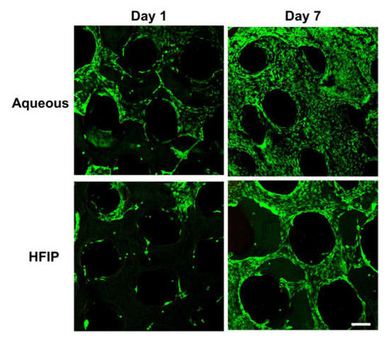 Cell viability on Aqueous-based and HFIP-based SF scaffolds. The aqueous-based SF scaffolds showed higher cell adhesion than on the HFIP-based SF scaffolds, and by day 7, cells were distributed throughout the scaffolds (scale bar: 200 μm).