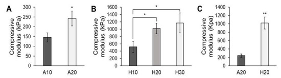 Compressive modulus values of (A) aqueous and (B) HFIP-based SF scaffolds. (C) Comparison of the compressive modulus values of the 20% aqueous and HFIP-based SF scaffolds. The mechanical strength of the SF scaffolds increased with increasing SF concentration. The HFIP-based SF scaffold showed higher mechanical strength than the aqueous-based SF scaffold (* p < 0.01, ** p < 0.005).