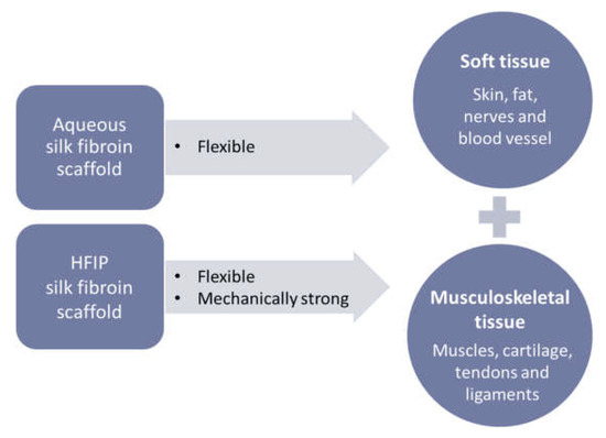 Interestingly, the SF scaffolds had different mechanical strength values depending on the SF concentration and process, which makes them suitable for use in various biological environments. Since natural human articular cartilage has a compressive modulus of approximately 1000 kPa, scaffolds with similar mechanical strength can be achieved by adjusting the concentration of HFIP-based SF [26]. In addition, the compressive modulus of human skin is around 300 kPa, which can be achieved by adjusting the concentration of the aqueous SF in the scaffold. Thus, aqueous and HFIP-based SF scaffolds with tunable mechanical strength are widely applicable to soft tissue injuries requiring flexibility and musculoskeletal tissue regeneration requiring high mechanical strength, respectively (Figure 9). In addition, through indirect 3D-printing technology, not only the shape of the SF scaffold but also the size and design of the pores can be controlled, and thus a scaffold with an ideal pore shape and size can be matched according to the biological function (e.g., 1–20 m for cellular growth and 100–1000 m for bone growth) [27].