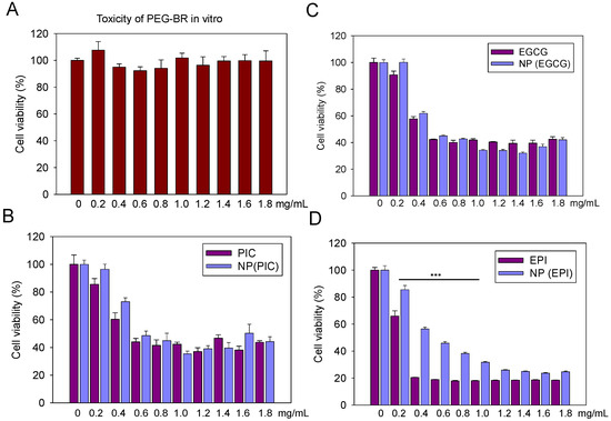 In vitro cytotoxicity analysis revealed that PEG-Br was non-toxic (A). EGCG (B) and PIC (C) retained similar cytotoxicity while EPI (D) showed decreased toxicity after encapsulation into NPs.
