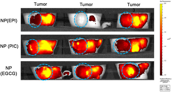 In vivo tumoral uptake of NP(EPI), NP(PIC) and NP(EGCG) in breast cancer allograft model. Blue circle indicated the location of tumor.