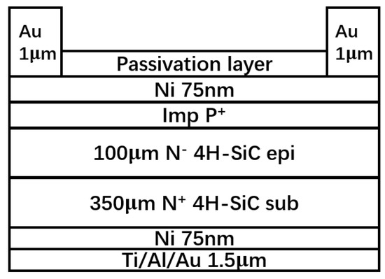We validated RASER by comparing measured and simulated time-resolution results of planar 4H-SiC detectors [24]. The planar 4H-SiC detectors are designed by Nanjing University (NJU), and the cross section of the detector is shown in Figure 1. The size of the detector is 5 mm × 5 mm, and the upper and lower electrodes are ohmic contacts. The detector has a 100 µm high resistance active 4H-SiC epitaxial layer and a 350 µm substrate. Using the same parameters, the time resolution of measurement and simulation are (83 ± 1) ps and (77 ± 2) ps, respectively. In this study, we simulated the time resolution of 3D 4H-SiC detectors with various structures and parameters, and the results would serve as a guideline for 3D 4H-SiC detector design and optimization.