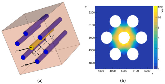 The structure of our 3D 4H-SiC detector prototype is shown in Figure 2a, where the electrode column that penetrates the entire high-resistance substrate perpendicular to the detector surface is surrounded by six electrode columns. The intention of designing this structure is to obtain a more uniform electric field in the area surrounded by the electrodes. The simulation size of the 3D 4H-SiC detector is 1 cm × 1 cm, and the thickness is 350 µm, and the effective concentration of n-type substrate is set to 1 × 10 cm−3. The radius of electrode column is 50 µm, and the column spacing, which is the distance between the center of and electrode columns is 150 µm. We carried out perforation experiments on the same size 3D 4H-SiC detector, which can verify the simulation results in the near future.