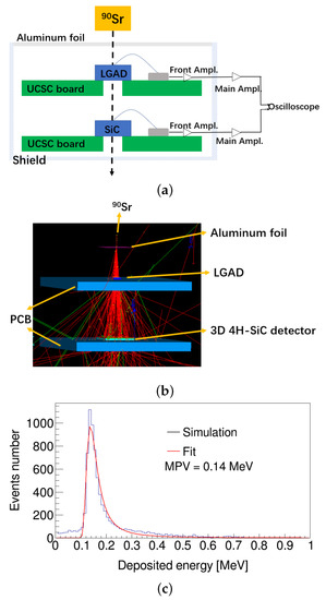The number of e–h pairs is determined by the deposited energy of charged particles. The -setup as shown in Figure 3a is used to measure the time resolution of the 4H-SiC detector. Sr source can emit two electrons with an energy of 0.55 MeV and 2.28 MeV [27], which will deposit energy in the detector. The signals of the LGAD and 4H-SiC detectors induced by the same electron will be recorded by the oscilloscope after a total of 100 times amplification by the PCB board designed by the University of California Santa Cruz (UCSC) [28] and the main amplifier. The aluminum foil and the shield are mainly served to reduce the impact of the environmental background, and the time resolution of LGAD was 34 ps. We simulated two electrons’ tracks and deposited energy by GEANT4 similar to the -setup as shown in Figure 3b. The deposited energy in 350 µm 3D detector is shown in Figure 3c, and the most probability value (MPV) was 0.14 MeV. The e–h pair creation energy of 4H-SiC was 7.8 eV, and 51 e–h pairs/µm were generated, which is consistent with the previous result of 56 e–h pairs/µm [10].