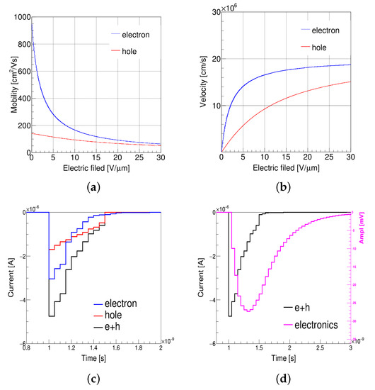 The induced current is produced by the motion of the e–h pairs, generated on the tracks of charged particles passing through the detector shown as a dotted arrow in Figure 2a. The magnitude of the induced current is mainly determined by the generated number of e–h pairs and the magnitude of the electric field.