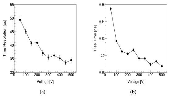 (a) Time resolution versus voltage. (b) Rise time versus voltage.