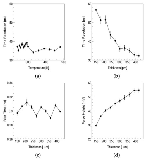 (a) Time resolution versus temperature. (b) Time resolution versus thickness. (c) Rise time versus thickness. (d) Pulse height versus thickness.