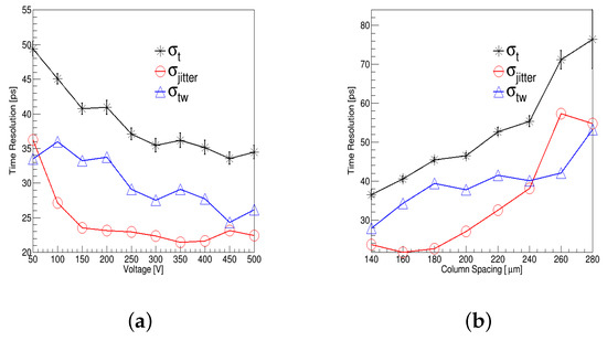 Figure 7a shows the distribution of , , and with different voltages. ≈ + . decreases as the voltage increases in the range of 50 V to 150 V, because an increase in the electric field will reduce and increase the signal-peak value in Equation (2). The change in voltage does not affect the hit position and deposited energy, so is almost unchanged. will increase with a column spacing increase as shown in Figure 7b, because the value of column spacing will change the hit-position area. Figure 7b also shows that the increase in the column spacing increases the drift time and thus . These results are consistent with expectations.
