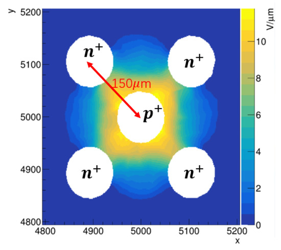 The simulation parameters and results of planar 4H-SiC, 3D 4H-SiC-with-seven-electrodes (3D-4H-SiC-7E), and 3D 4H-SiC-with-five-electrodes (3D-4H-SiC-5E) detectors are given in Table 1. The electric field of the x–y cross section for 3D-4H-SiC-5E detector is shown in Figure 8, where the column spacing is 150 µm. The 3D-4H-SiC-5E detector removes two electrodes based on the structure of Figure 2b, and the remaining four electrodes become a square distribution. The time resolution of the planar detector is larger than the 3D detector because of a smaller pulse height and a larger rise time. The time resolutions of 3D-4H-SiC-5E are slightly better than the 3D-4H-SiC-7E configuration. The pulse height of 3D-4H-SiC-7E detector is smaller, because the more electrodes, the smaller the effective area. Table 1 reveals that the 3D detector can achieve a smaller rise time and a larger pulse height simultaneously, which means that the 3D detector has the potential to become a good time-resolution and a high-radiation-resistance detector. To achieve a better time resolution and the simplification of the fabrication process, 3D 4H-SiC detectors produced in the future will be mainly five electrodes.