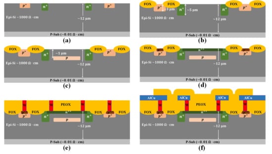 The designed Si APD is fabricated using CMOS technology without any process modification. The 8-inch p-type <100> wafer used to fabricate the device comprises a -thick silicon epitaxial layer with resistivity of and a thick substrate with resistivity of . Figure 2 shows the key process for the fabricated Si APD. First, the wafer was implanted with boron and phosphorus in sequence to form the p-tub region (p-well) and n-type guard-ring (n-well) as shown in Figure 2a. Second, field oxide (FOX) is used to isolate the regions with different type doping and the adjacent devices, which was implemented by the local oxidation of silicon (LOCOS) technology, as shown in Figure 2b. At the same time, the drive-in for p-well and n-well is accomplished by the high temperature () process used in LOCOS. Third, the charge layer was formed by an implantation with high-energy and low-dose followed by a high temperature annealing in furnace, as shown in Figure 2c. The doping profile of the charge layer plays a determinative role in controlling the electric field inside the photons absorbing region and the multiplication region. However, the implanting energy is limited in a modern foundry so that the peak doping concentration position (projected range, ) of the charge layer is consequently limited. Fortunately, the can be increased by the channeling effect, which should be avoided in most cases []. Thus, the wafer cleaning before charge layer implantation is very important. Fourth, the heavy doping for Ohm contacts was formed by sequentially implanting the patterned region with boron and phosphorus in low energy and high dose, as shown in Figure 2d. A high-temperature annealing was conducted immediately to activate the dopants and repair the implanting damage. Fifth, the tungsten plus were formed to reduce the connection resistivity after the chemical-mechanical polishing (CMP) of the intermetallic dielectric layers 0 (ILD0), as shown in Figure 2e. Finally, the AlCu alloy was deposited and patterned to form the metal pads, as shown in Figure 2f.