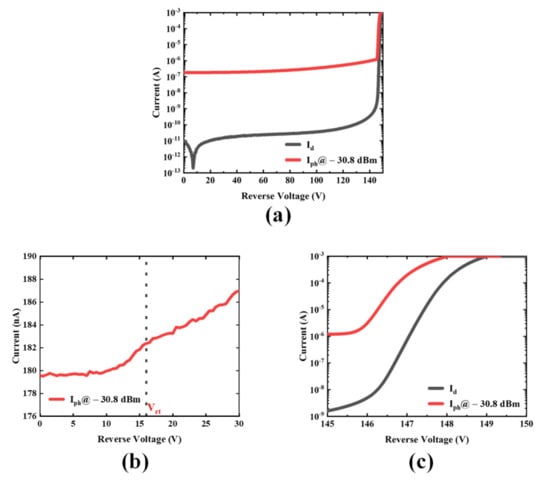 A single-mode semiconductor laser with wavelength of 905 nm is used to characterize the photocurrent of the Si APD. The output optical power is approximately −29.8 dBm, which is checked by an optical power meter PM20 from Thorlabs. The incident optical power is estimated to be −30.8 dBm, specifically 832 nW, considering about 1 dB loss from the fiber and reflection. The photocurrent initially increased in a relatively gentle trend until Vr reaches 146 V due to the relatively weak multiplication effect. The photocurrent increases at a slower rate as Vr reaches the punch-through voltage (Vrt) at which the photon absorbing region is fully depleted. Such change is demonstrated in Figure 3b. With remarkable avalanche multiplication, the photocurrent rises very rapidly and reaches a plateau caused by the current compliance as shown in Figure 3c.