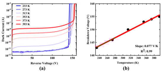 Temperature characteristics of the device: (a) dark current versus reverse voltage under different temperature; (b) breakdown voltage versus temperature (black dot: measured data, red line: linear fit).