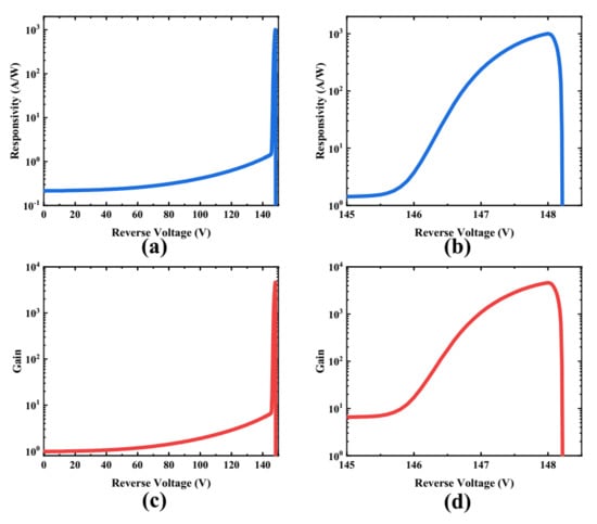 where Iph(Vrt) and Id(Vrt) are the photocurrent and dark current at the punch-through voltage, and R(Vrt)is the primary responsivity. It is clearly shown in Figure 6c that the growth trend of the current gain is almost same as the responsivity due to the tight relationship between them, as shown in Equation (3). The maximum current gain, 4610, was also measured at the breakdown voltage, as depicted in Figure 6d. The voltage at which the gain reaches 100 is 146.4 V for the fabricated device, which is the operating point for most commercial products.