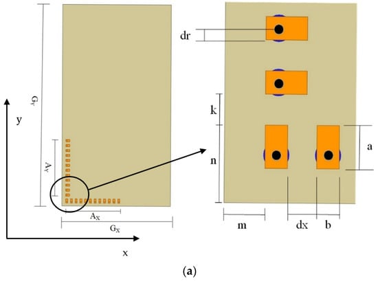 Figure 1 depicts the geometry of the antenna. A set of two linear arrays, consisting of 12 microstrip patch antenna elements in each, are placed orthogonally over a dielectric substrate, Rogers RT/Duroid 5880, which has a dielectric constant of 2.2, loss tangent of 0.0009, and a thickness of 0.787 mm. The arrays are arranged at a corner of the grounded substrate (shown in Figure 1a). The entire substrate is 90 mm long (denoted by ‘GX’) and 160 mm wide (denoted by ‘GY’), which is similar to the size of a modern-day smartphone. However, the area covered by the antenna arrays is only 56.5 × 6 mm2 along each side at one corner of the substrate, where each array length is 53.7 mm along the x and y-axes, denoted by ‘AX’ and ‘AY’, respectively. The length and the width of each patch antenna are 3.1 mm and 2 mm, denoted by ‘a’ and ‘b’, respectively, as shown in Figure 1a (right). The feed probe is located 0.6 mm away from the center of each patch on the center line along its width. The edge-to-edge spacing between elements is 2.4 mm (denoted by ‘k’ and ‘dx’ in y-axis and x-axis, respectively), and the antennas are placed 2.5 mm (denoted by ‘m’) away from the edges. The distance from the edge of the ground plane to the inner edge of the patch at the corner is 5.9 mm (denoted by ‘n’), and from the edge of patch to its center is 1 mm (denoted by ‘dr’). The number of antenna elements and their orientation on the substrate are optimized to obtain a gain of 12 dBi or more for a large scanning range of +/−45°. Figure 1b,c shows the 3D view and the fabricated prototype of the structure, respectively. All the dimensions of the antenna arrays are listed in Table 1.