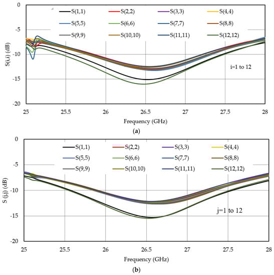 Figure 2. Scattering parameters: S(i,i) and S(j,j) of the antenna array elements for the (a) x-axis-oriented array and (b) y-axis-oriented array, respectively.