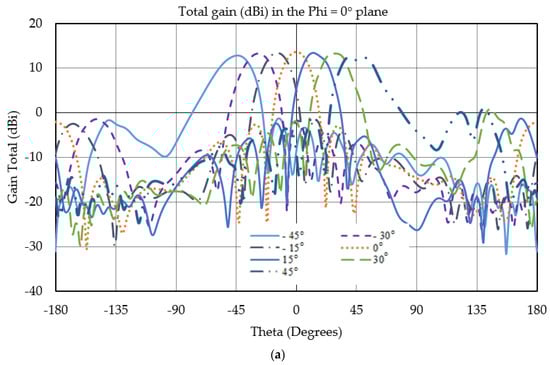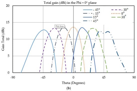 The narrow beamwidth of the antenna mitigates high path loss and possesses better selectivity attenuating undesired signals. However, beamwidth increases as the main beam is scanned away from boresight. The arrays’ excitations are adjusted so that the main lobe can be scanned as far as possible maintaining a low sidelobe level and reasonable gain. Otherwise, it may increase the noise level. The maximum broadside gain is 14.1 dBi as can be noticed in Figure 3, whereas the minimum gain of the antenna is 12.9 dBi observed at a scanning angle of 45°. As the scanning angle increases, the gain drops and the beamwidth increase. Figure 3a exhibits the gain of the antenna arrays and Figure 3b shows zoomed-in inset of peak of total gain for various scanning angles; only the array along the x-axis is excited.