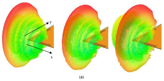 Figure 4 presents the 3D radiation patterns of the antenna for −30°, 0°, and 30° scanning angles. When the array along the x-axis is excited, the scanning is achieved in the φ = 0° plane, and it is possible in the φ = 90° plane when the array along the y-axis is excited. While the beamwidth is narrow in the plane containing the array and main beam, it is wider in the other plan due to linear arrangement of the array elements.