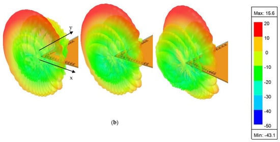 Figure 4. Simulated 3D radiation patterns for −30°, 0°, and 30° scanning angles: (a) when the x-axis-oriented array is excited and (b) when the y-axis-oriented array is excited.