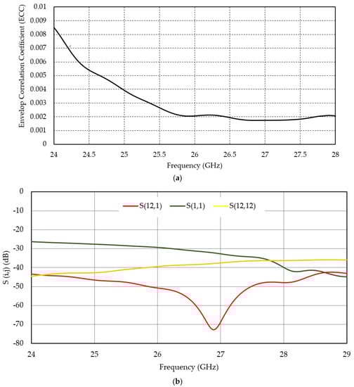 Figure 5a shows the plot of ECC for two orthogonal arrays of the antenna. Since two sets of arrays are placed orthogonally to each other, the expected ECC value within the range would be approximately zero. The maximum value of the correlation coefficient can be found at the upper end of the band, which is 0.0065. In comparison to other designs, this ECC value less of than 0.0065 is quite low []. The orthogonal polarization of these two arrays ensures a good ECC performance from this arrangement.